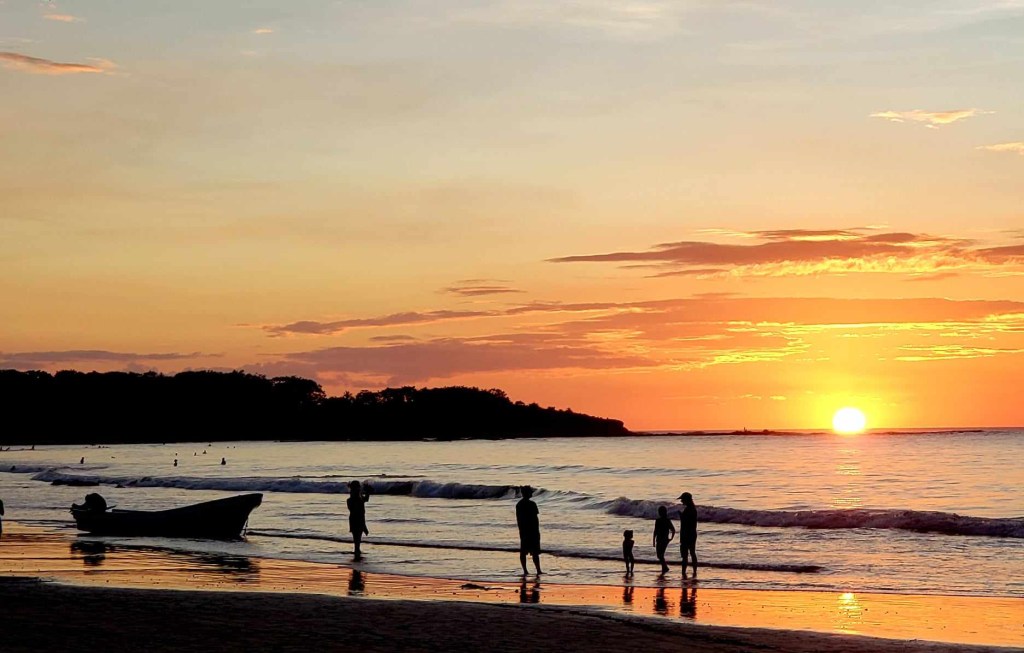 Tamarindo, hier soir, après le magnifique coucher de soleil (voir photo à la fin de ce texte). La Nature me fascine; chaque jour est différent et unique. La Vie est un spectacle perpétuel de beauté, quand on sait où regarder. Y’a pas d’effet sur la photo, le ciel était vraiment scindé en 2, pas branché sur la couleur a adopter. Finalement, le rose est devenu orange et le bleu s’est obscurci. Souvent, les gens pensent que le show se termine lorsque la boule d’or disparaît, mais en réalité, le panorama devient encore plus hallucinant par la suite. Faut être patient afin de profiter au maximum de ce tableau céleste.